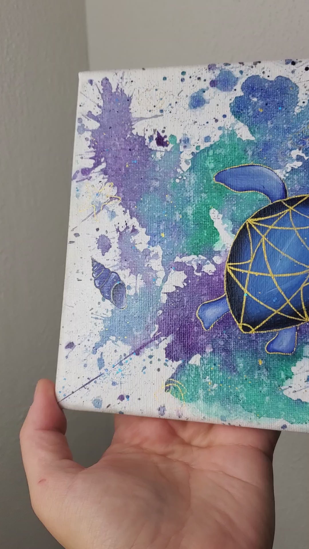 Das Bild wurde auf einer Leinwand gestaltet – mit liebevoller Detailarbeit und magischem Farbspiel in Grün, Blau, Lila und türkisen Glitzerflakes. Jedes Sprenkeln erzählt eine kleine Geschichte – voller Licht, Leichtigkeit und Stille.